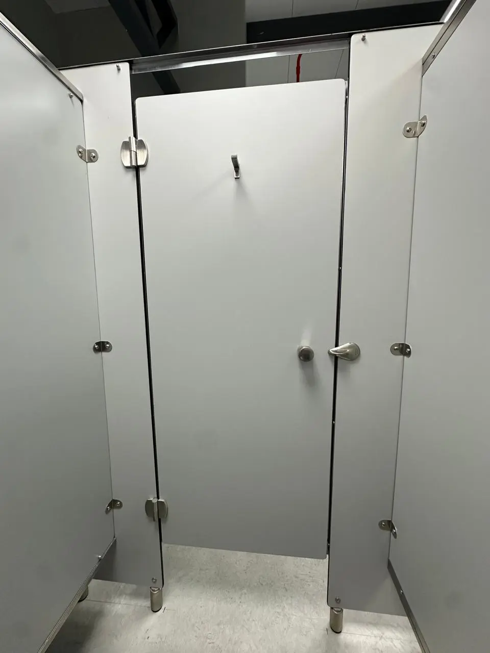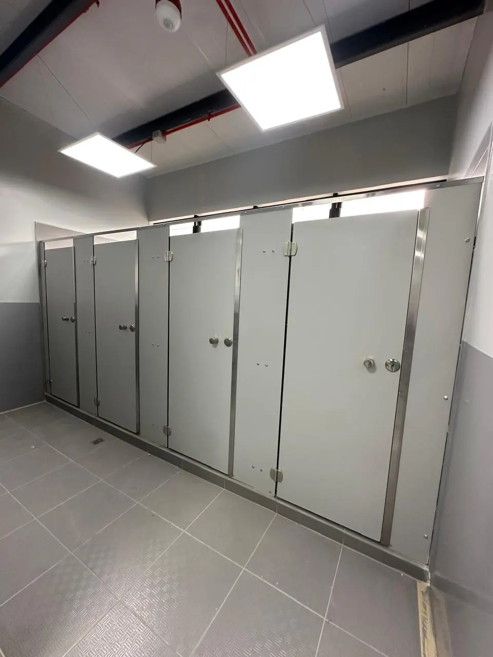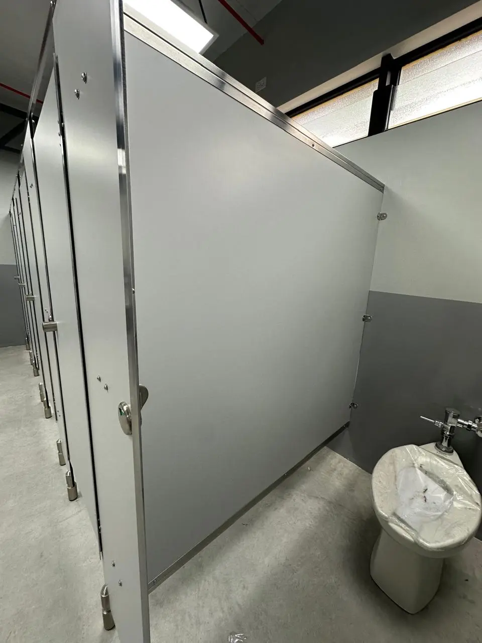 Las mamparas en HPL (laminado de alta presión) son ideales para entornos industriales. Son resistentes al agua, fáciles de limpiar y soportan alto tráfico diario. Por eso se usan mucho en fábricas, centros comerciales y edificios corporativos.