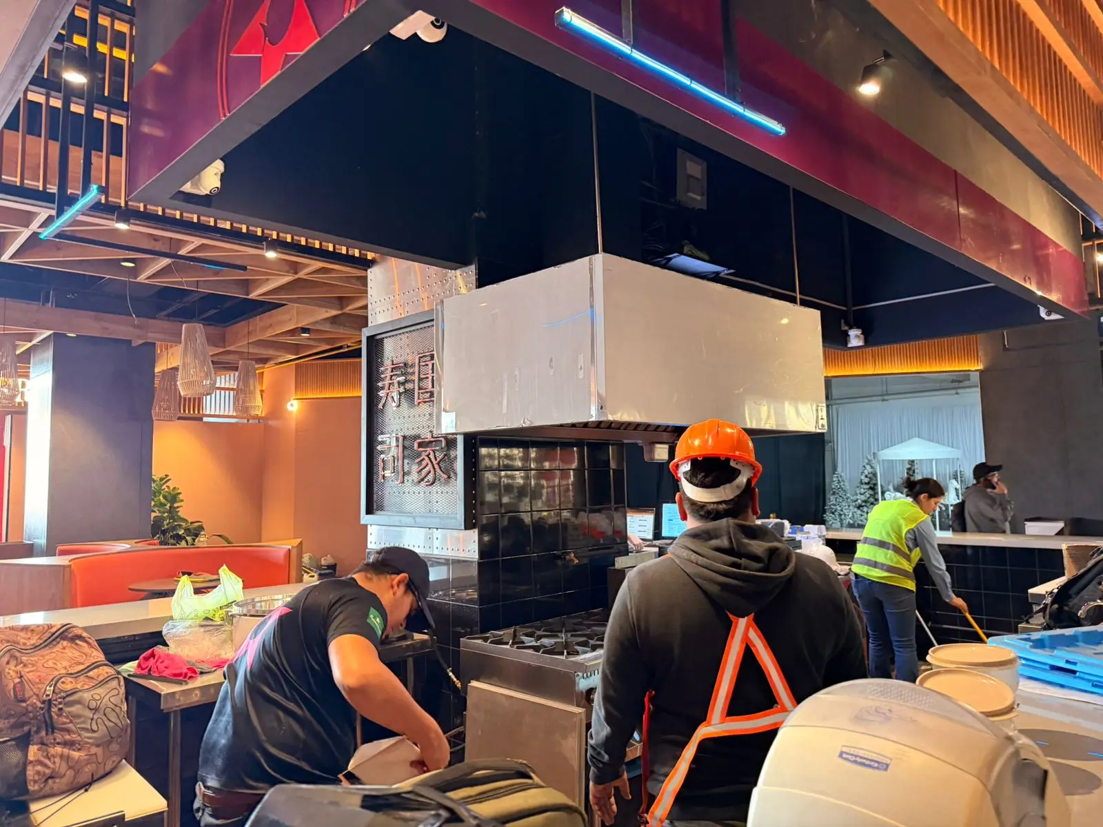 El proyecto incluyó el diseño y montaje de una campana industrial, toda la ductería de extracción y una fachada decorativa en acero inoxidable para integrar la columna al diseño del restaurante. Funcionalidad primero, estética después, pero sin sacrificar ninguna.
